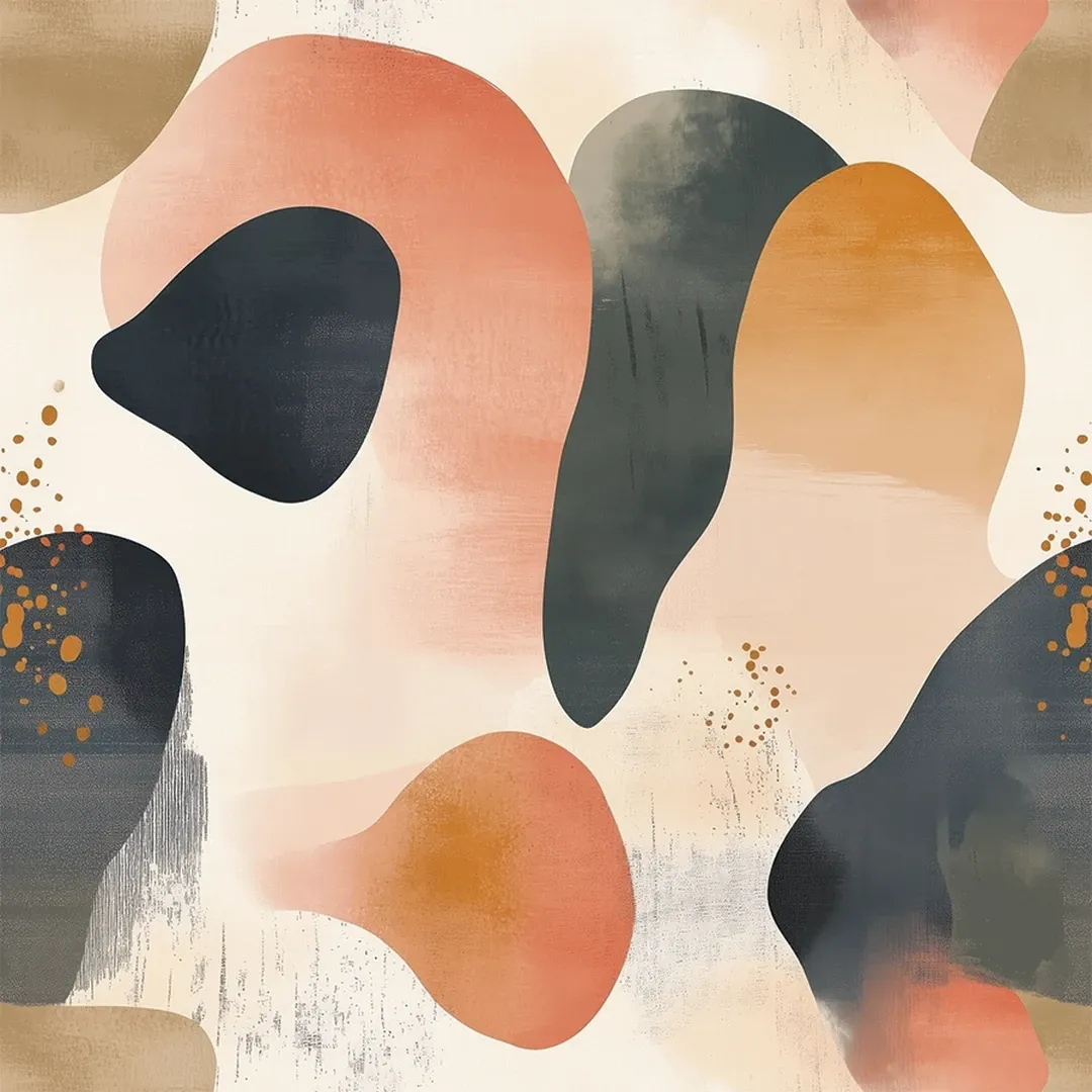 This wallpaper design showcases a harmonious blend of organic shapes in earthy tones of burnt orange, deep green, beige, and soft peach. The fluid, amorphous forms create a dynamic yet soothing composition, reminiscent of nature-inspired movement. Subtle textured brushstrokes and delicate speckled details add depth and a hand-painted effect, making it a perfect choice for contemporary and modern interiors.
