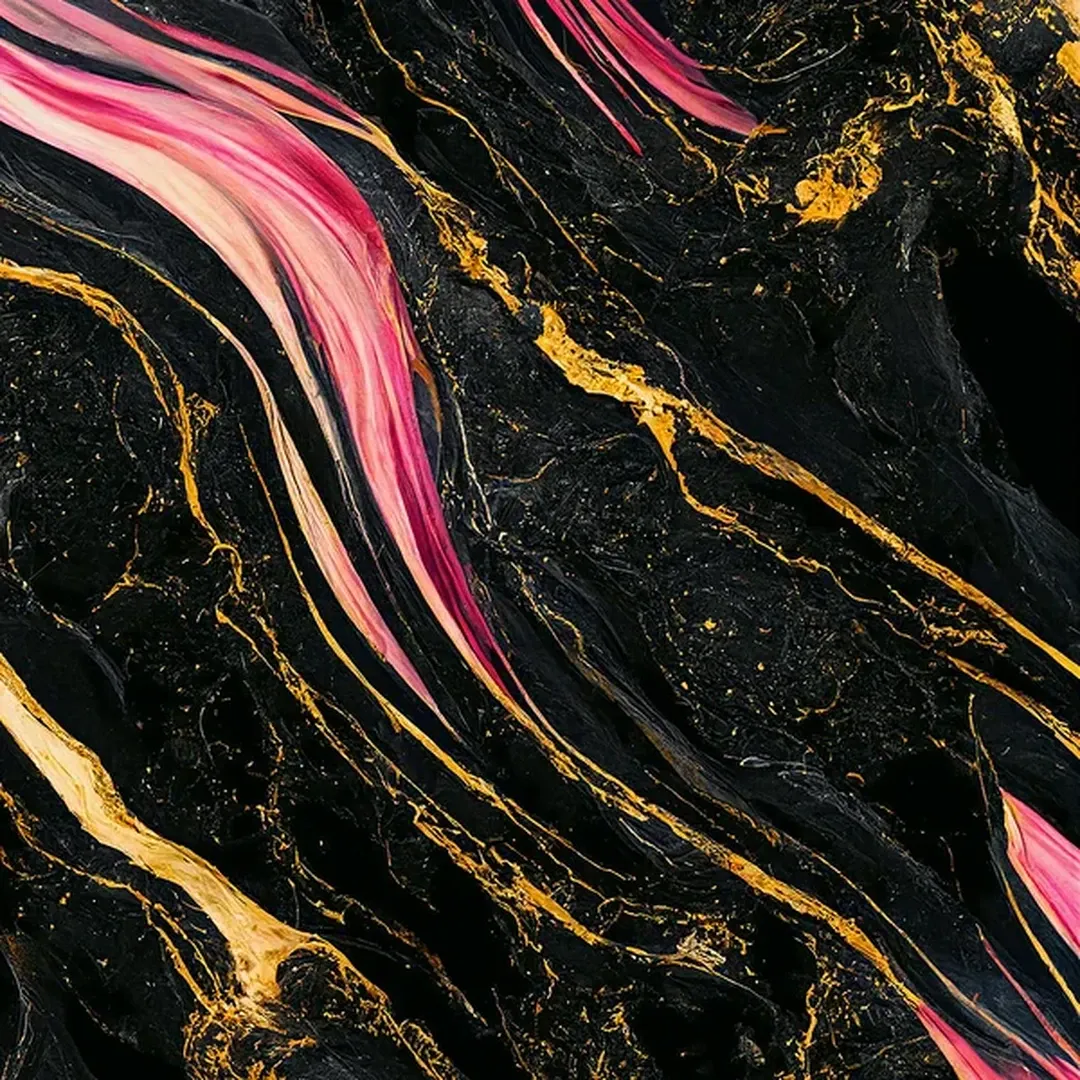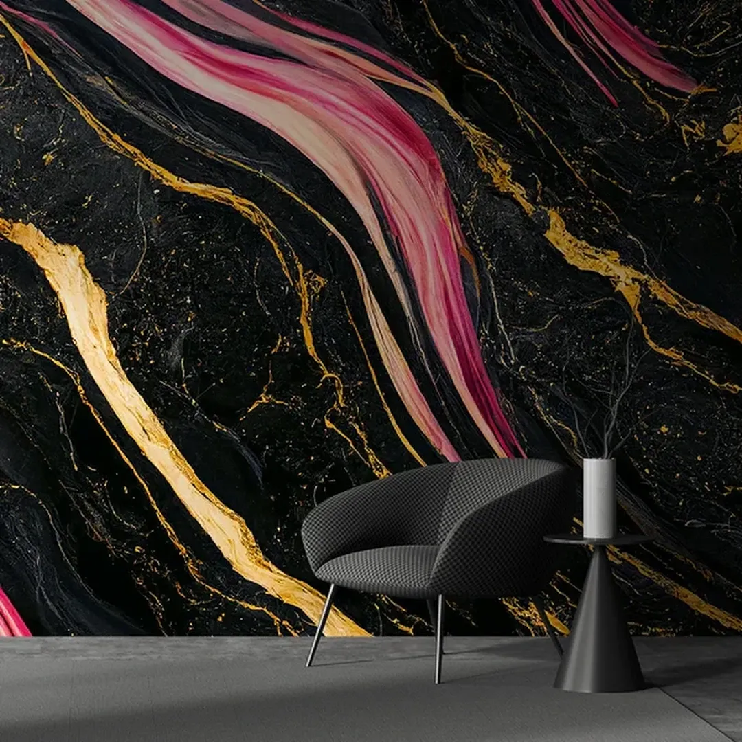 This wallpaper boasts a bold contrast of deep black marble with striking gold and pink veins. The black base exudes mystery and drama, while the sweeping strokes of pink and metallic gold add vibrant energy and a touch of luxury. It’s perfect for creating a statement wall in a modern, stylish setting.