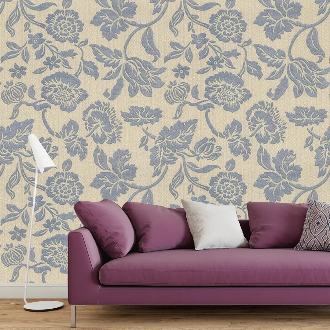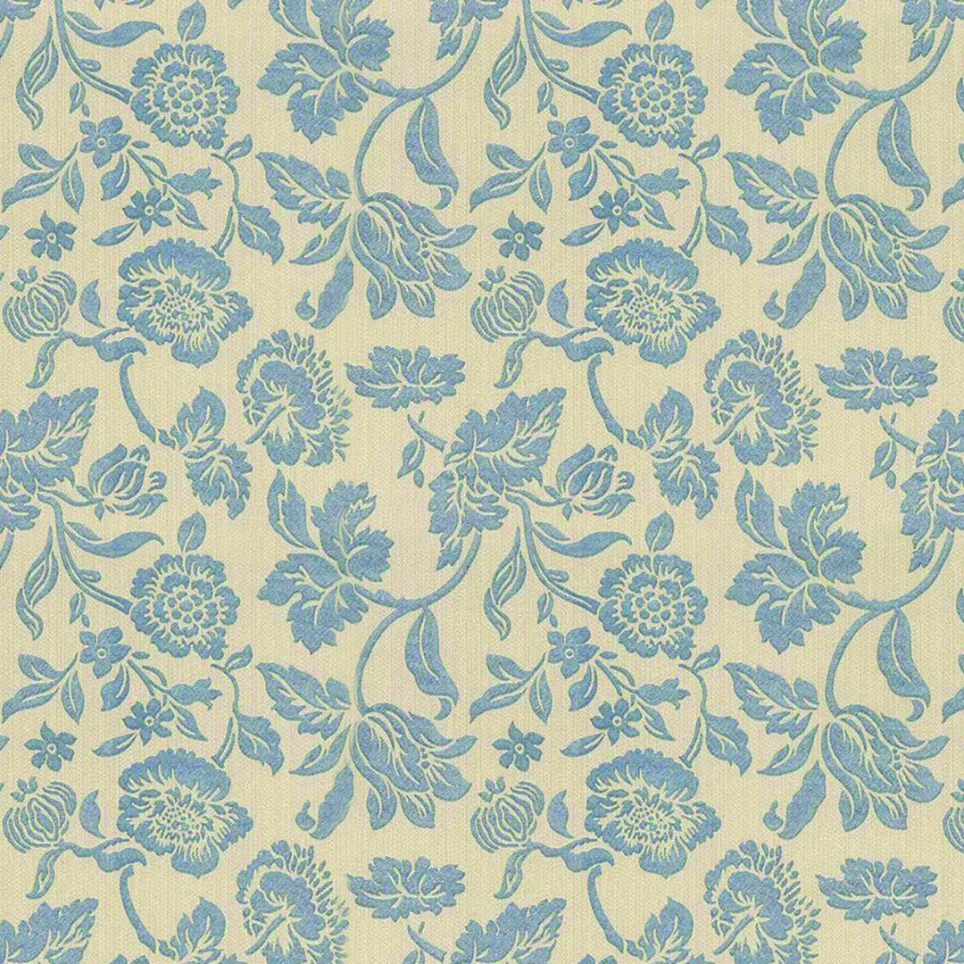 Vintage blue florals on a soft beige background bring timeless elegance. Great for dining