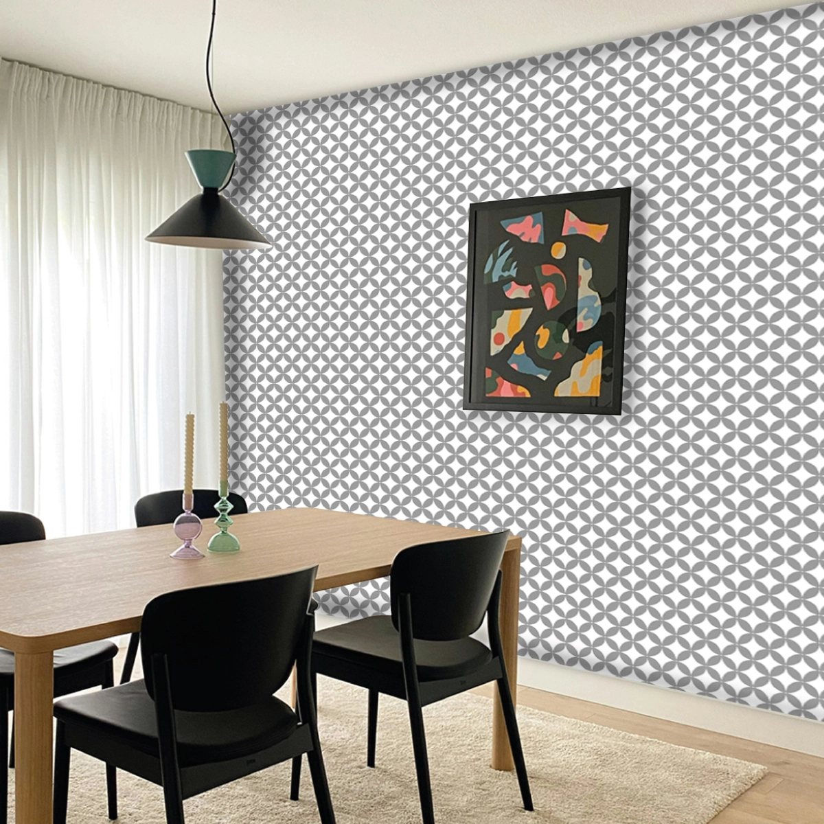 Circular motif in gray and white adds balance and sophistication to dining rooms.