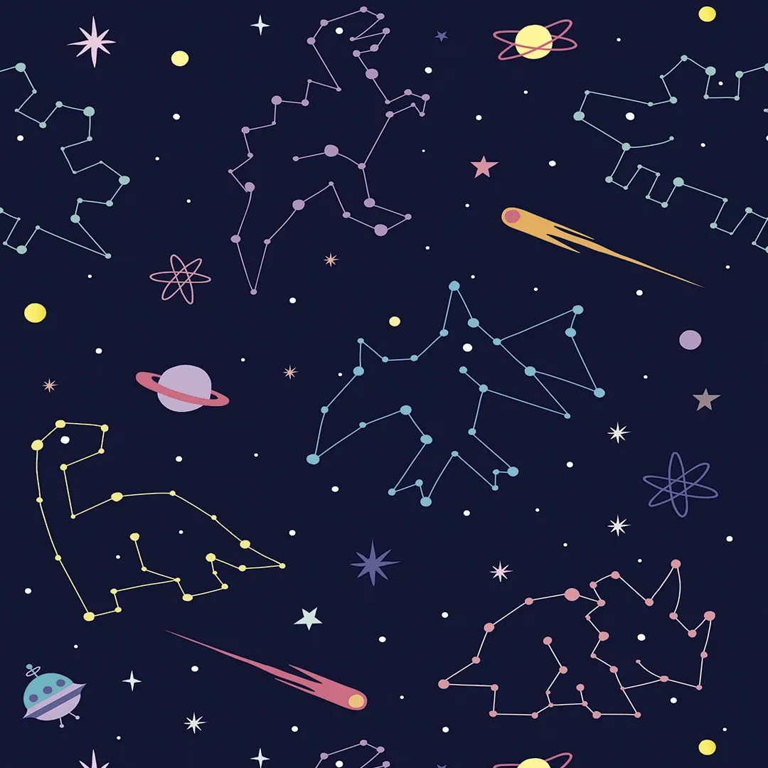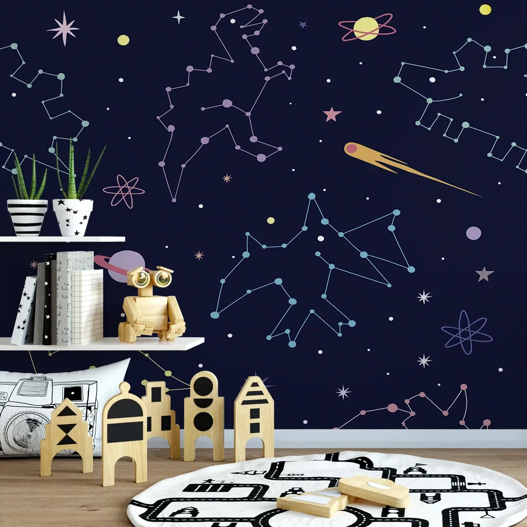 This wallpaper features a dark cosmic background adorned with whimsical dinosaur constellations. Accentuated by shooting stars, planets, and playful geometric elements, it creates a dreamy, celestial ambiance perfect for a child’s room or any space seeking a touch of imagination.
