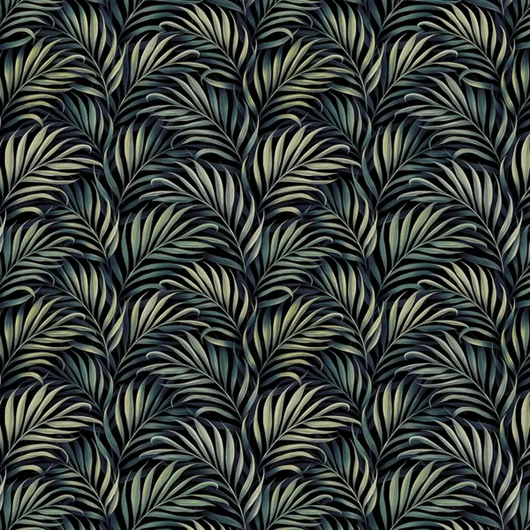 With a dark, almost black background, this wallpaper presents an intricate pattern of palm leaves in deep greens and gold hues. The layered, swirling leaves create a tropical yet sophisticated look, ideal for creating a lush, calming atmosphere. It’s a bold choice that brings a touch of the exotic to interiors without overwhelming the space.