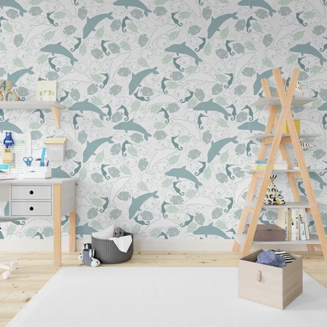 This refreshing underwater-themed wallpaper features playful dolphins, fish, seahorses, and soft coral shapes in calming shades of blue and green. Perfect for kids’ rooms, bathrooms, or ocean-inspired spaces, it creates a serene and joyful atmosphere.