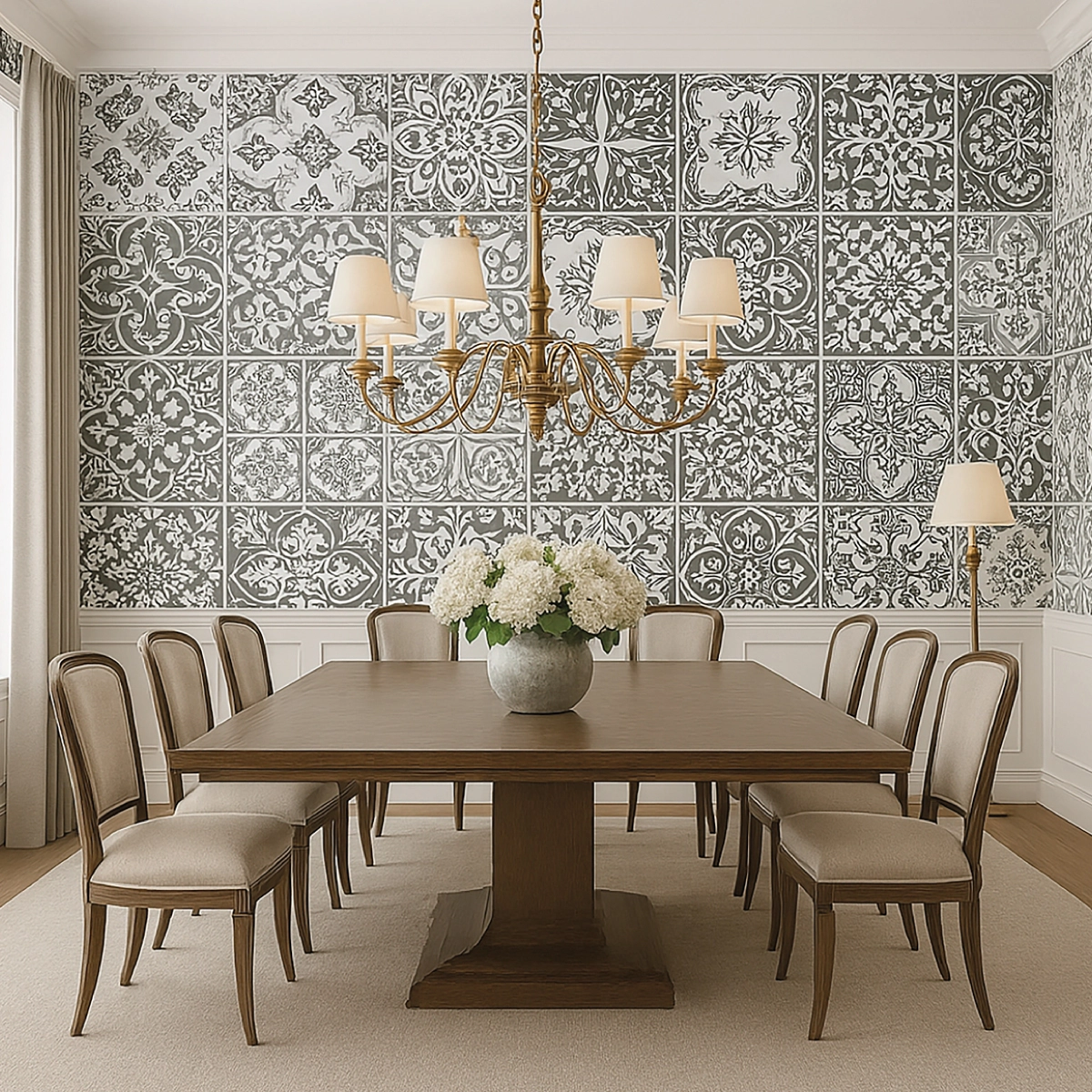 This charming tile wallpaper features vintage-inspired patterns in a muted color palette, ideal for creating a cozy and inviting dining room. Perfect for farmhouse or rustic chic themes.