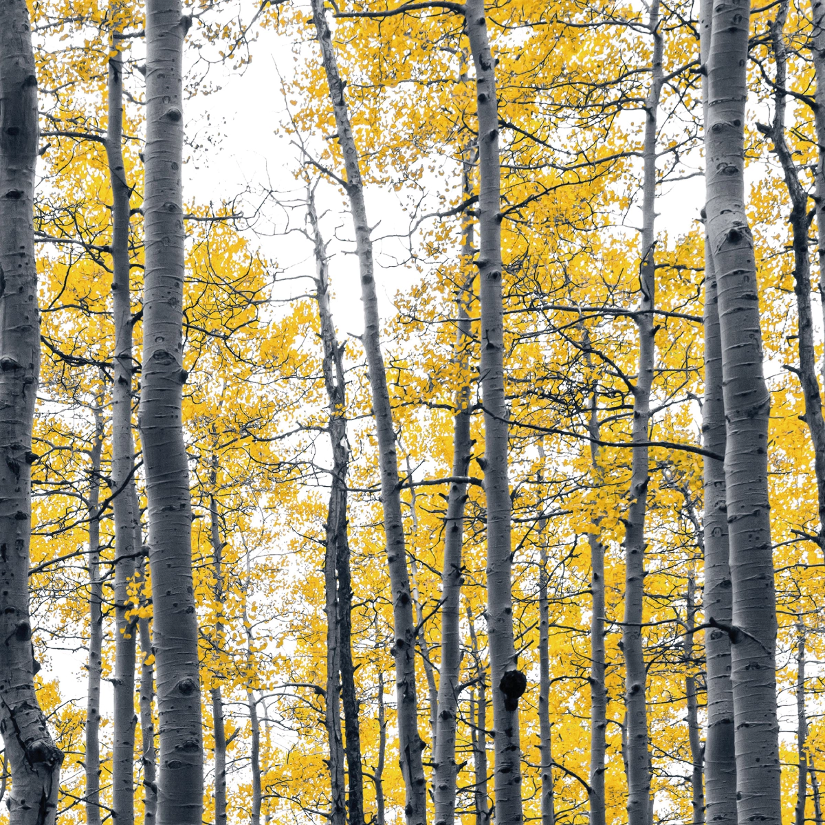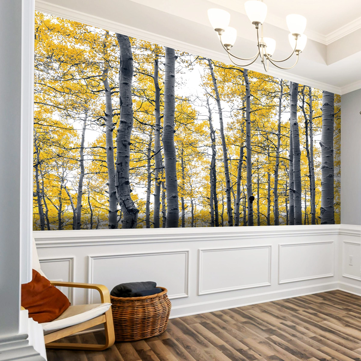 Immerse your room in the quiet beauty of an aspen grove with this serene wallpaper mural. The golden foliage contrasted against the smooth, grey trunks creates a clean yet rustic atmosphere. Ideal for cozy corners or elegant living areas, this design brings a refreshing touch of nature and light into any room.