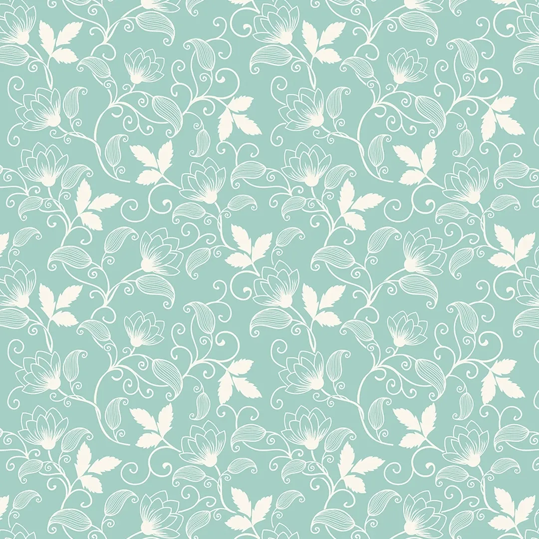 A classic sage background with crisp white flowers and swirling details, perfect for hallways,