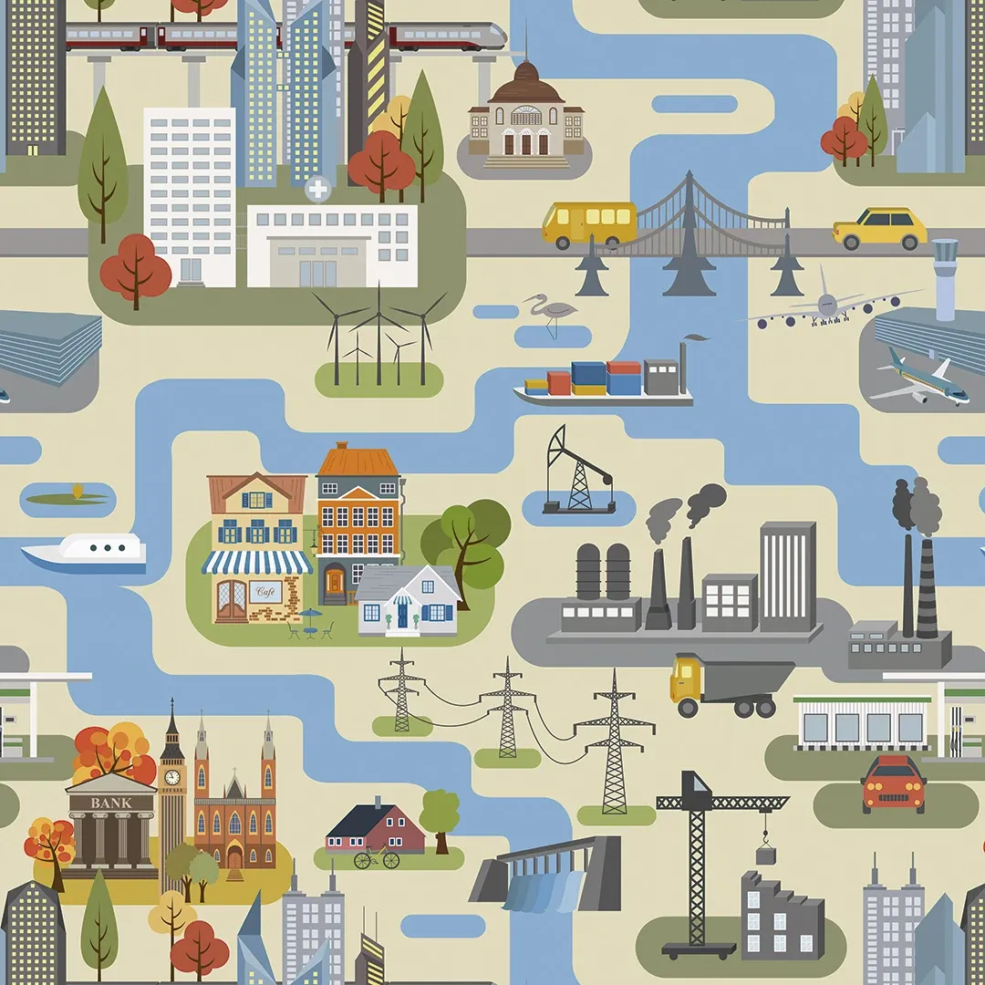 Celebrate the harmony between urban and rural landscapes with this unique wallpaper. From bustling cities and factories to serene rivers and wind turbines, this design brings together diverse elements of human innovation and natural beauty. Perfect for educational spaces or accent walls.