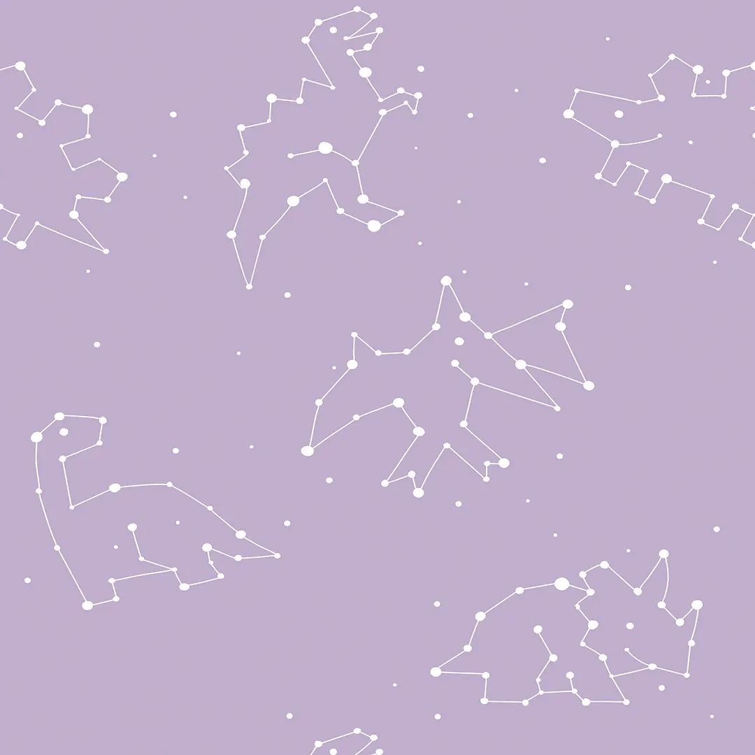 This soft lavender wallpaper highlights white dinosaur constellations, adding a subtle celestial charm. Its soothing tone and magical theme make it a wonderful choice for bedrooms or creative corners.