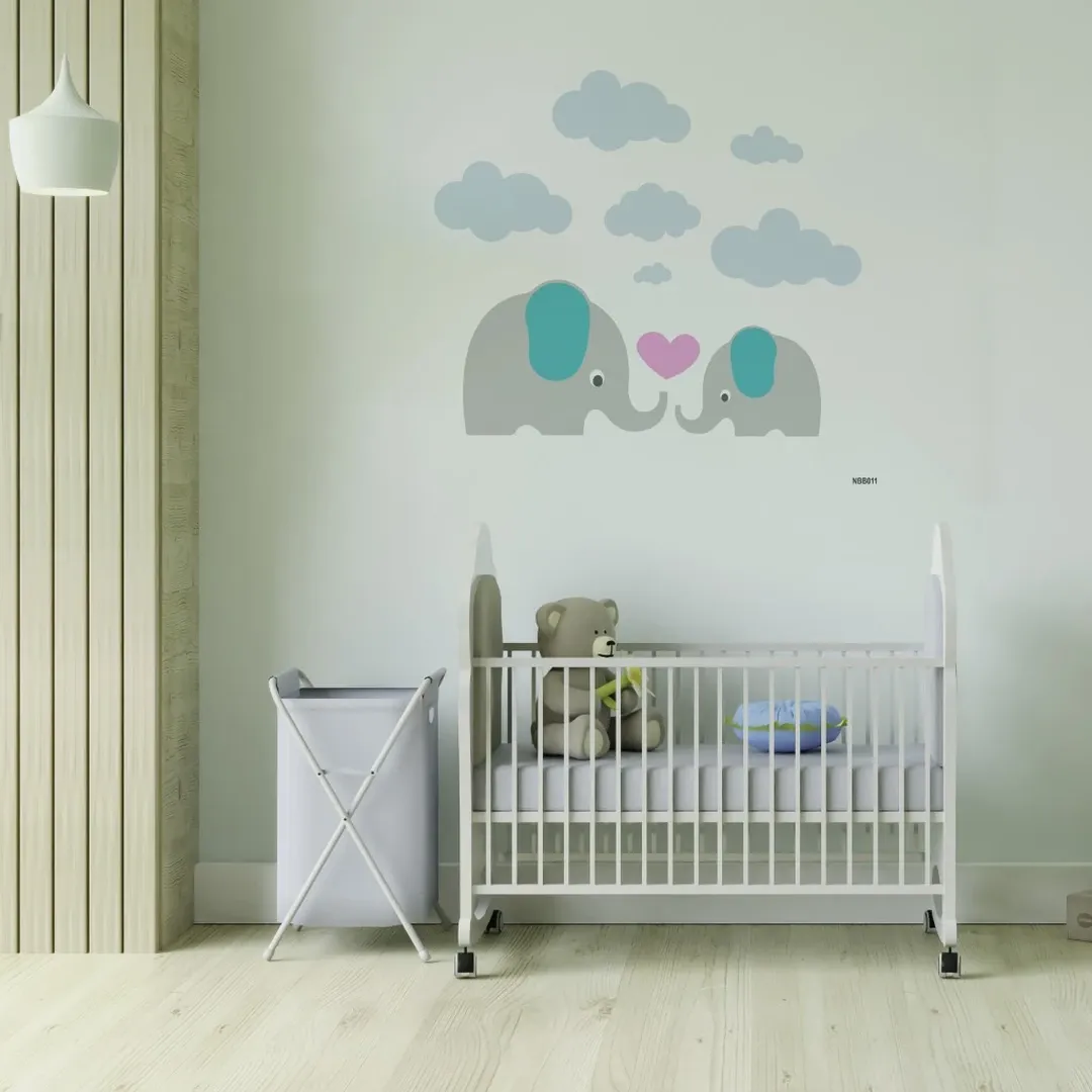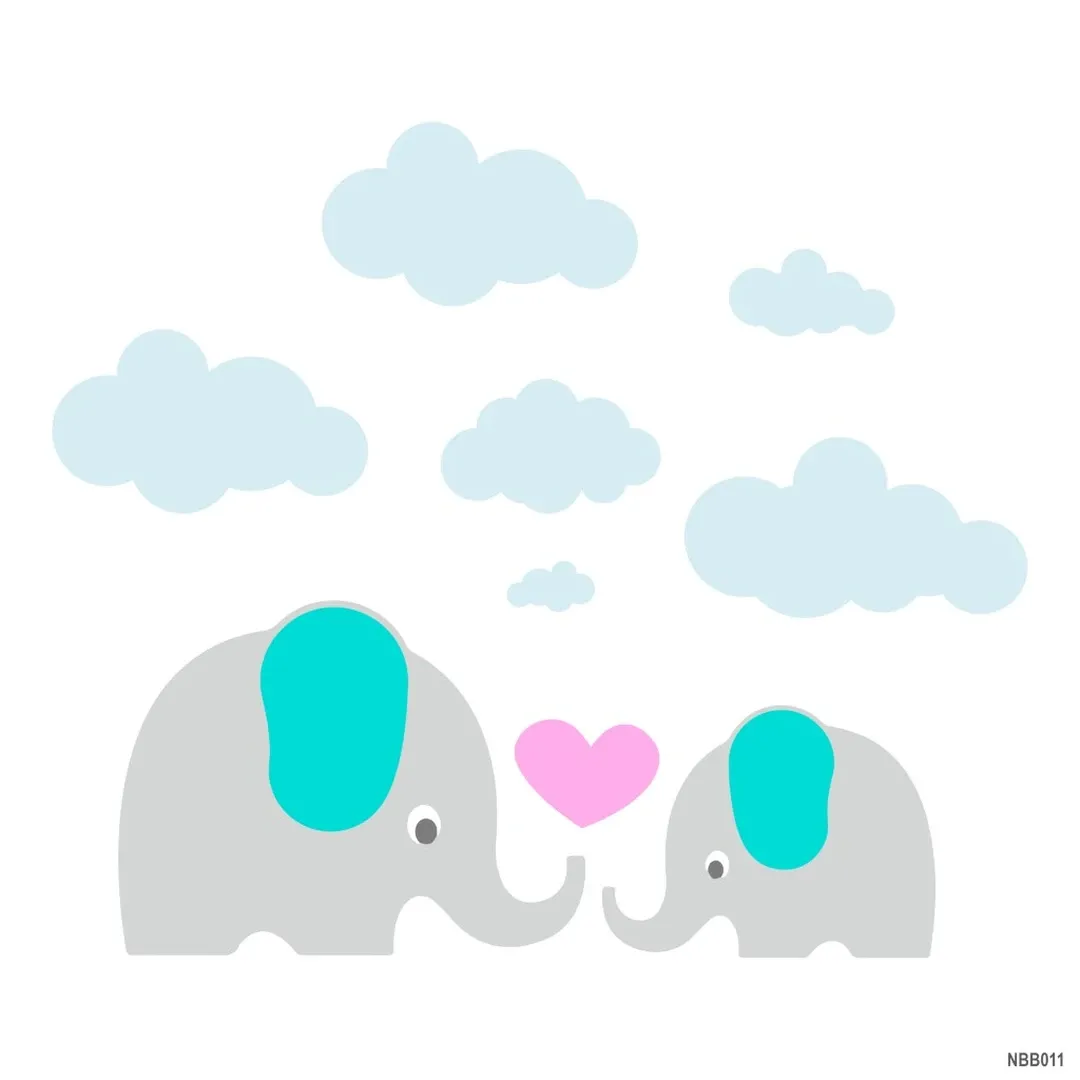 This sweet wallpaper design features two gentle elephants facing each other with a pink heart in the center, surrounded by soft blue clouds. A perfect addition to nurseries or baby rooms, it brings a sense of love, warmth, and tranquility.