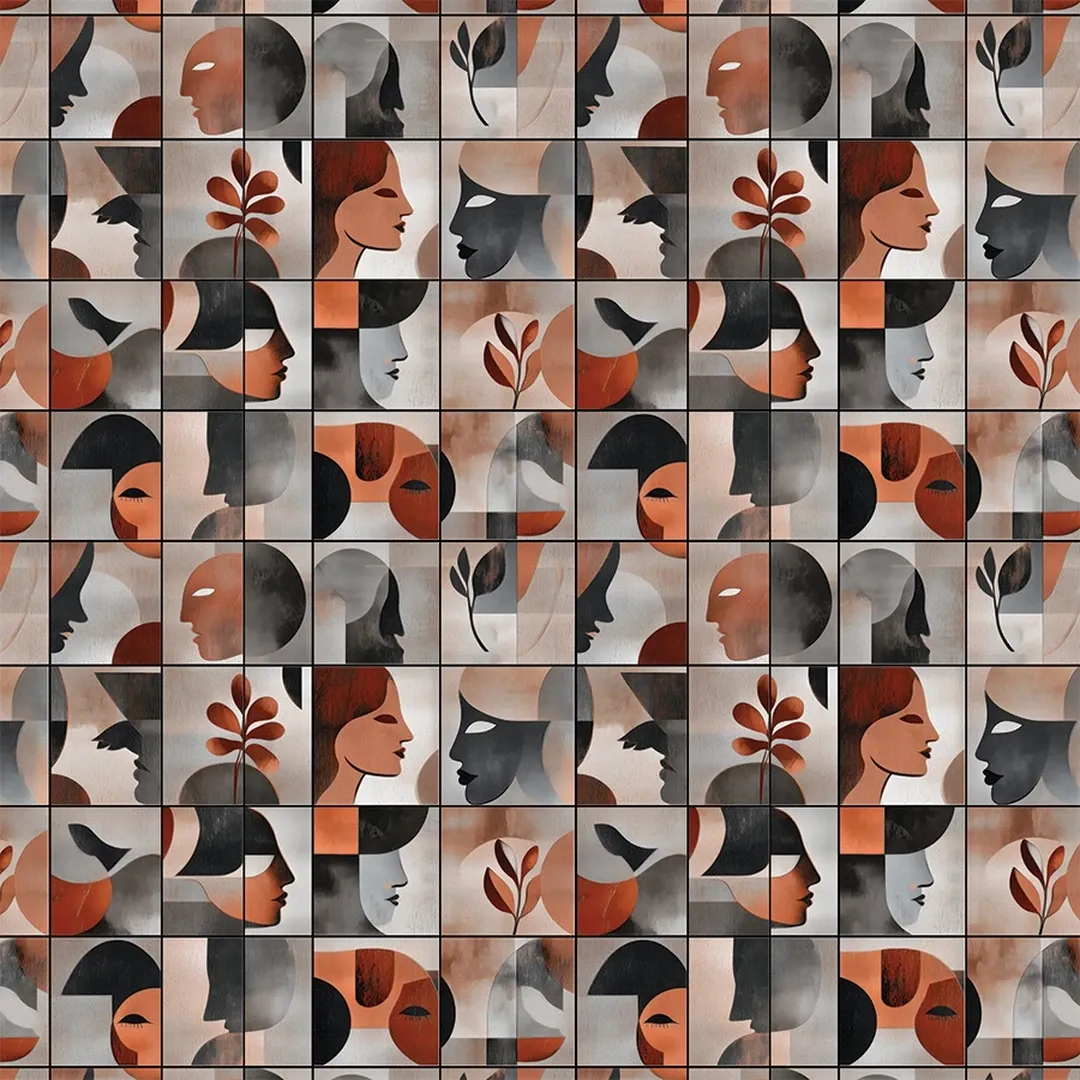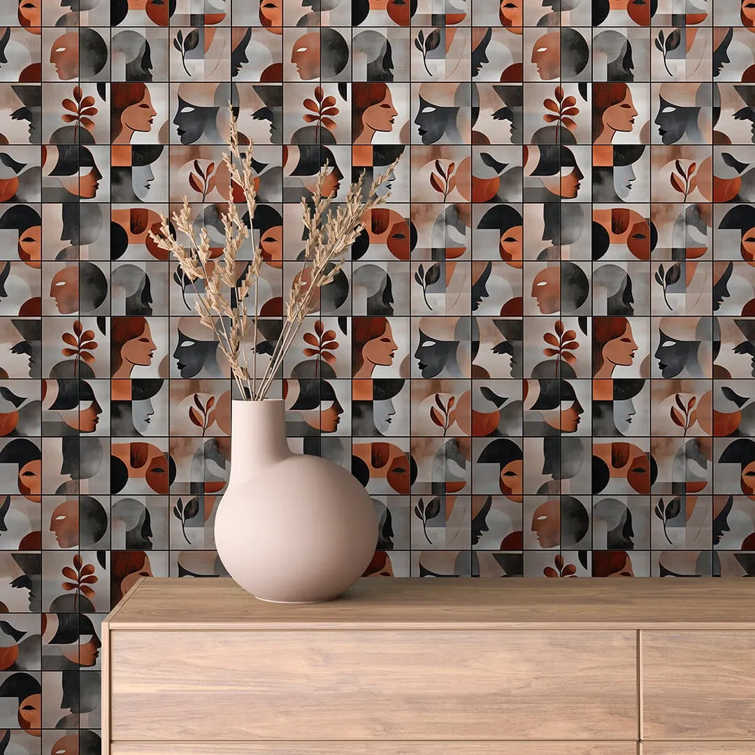 A sophisticated and artistic wallpaper inspired by Cubism, featuring abstract human faces and botanical elements in earthy shades of terracotta, black, and gray. The geometric layout and muted color palette create a refined yet expressive ambiance, ideal for contemporary and minimalist interiors.