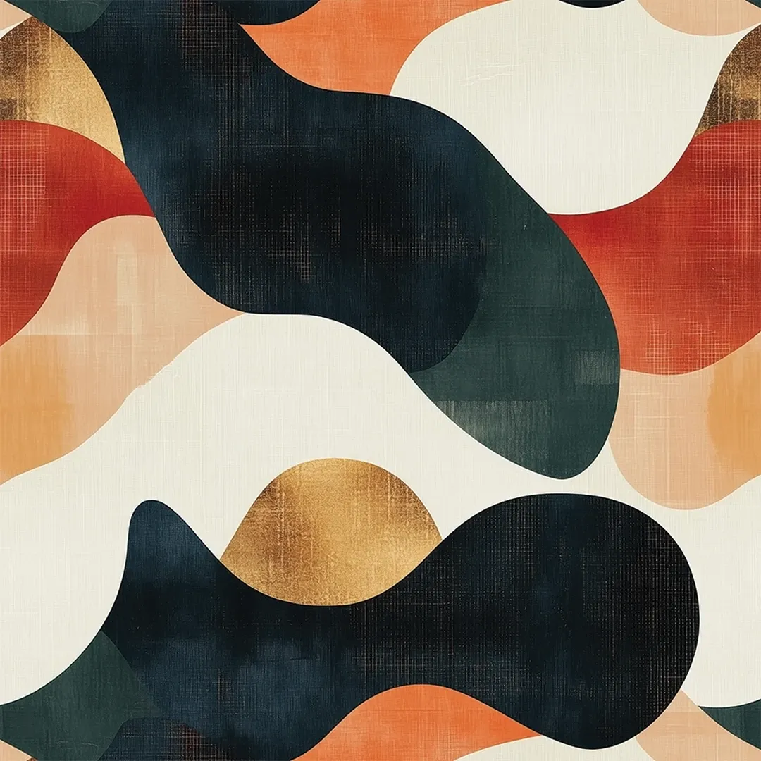 Inspired by natural movement and organic shapes, this wallpaper blends deep greens, burnt orange, and creamy neutrals. The fluid design and subtle gold detailing add depth and richness, making it an eye-catching focal point.