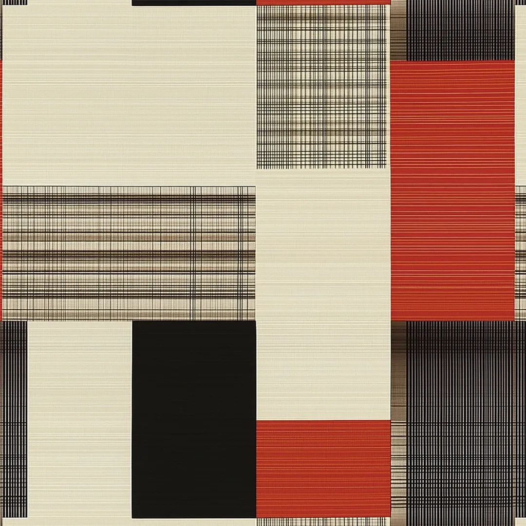 A contemporary take on classic plaid, featuring bold geometric blocks in warm red, black, and neutral tones. The structured composition blends traditional textures with a modern aesthetic, making it a stylish choice for sophisticated interiors.