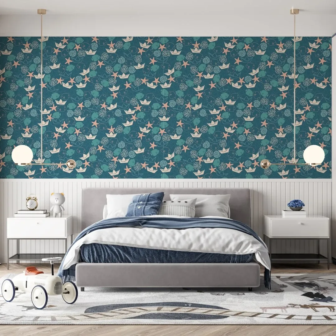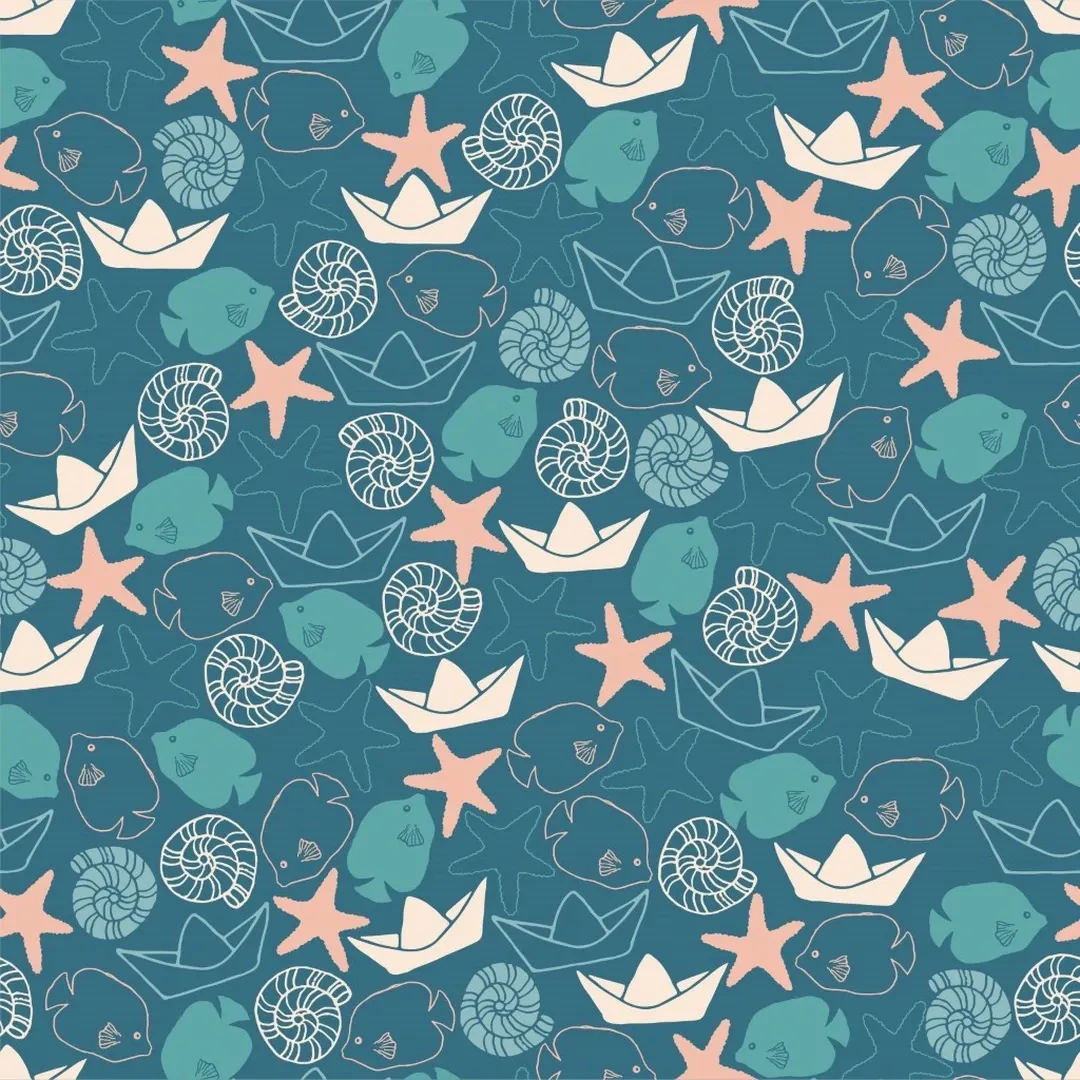 Dive into the ocean with this charming nautical-themed wallpaper featuring seashells, starfish, paper boats, and fish. The deep blue background with soft coral and white accents creates a serene, marine-inspired atmosphere, perfect for bathrooms, beach houses, or coastal-themed spaces.
