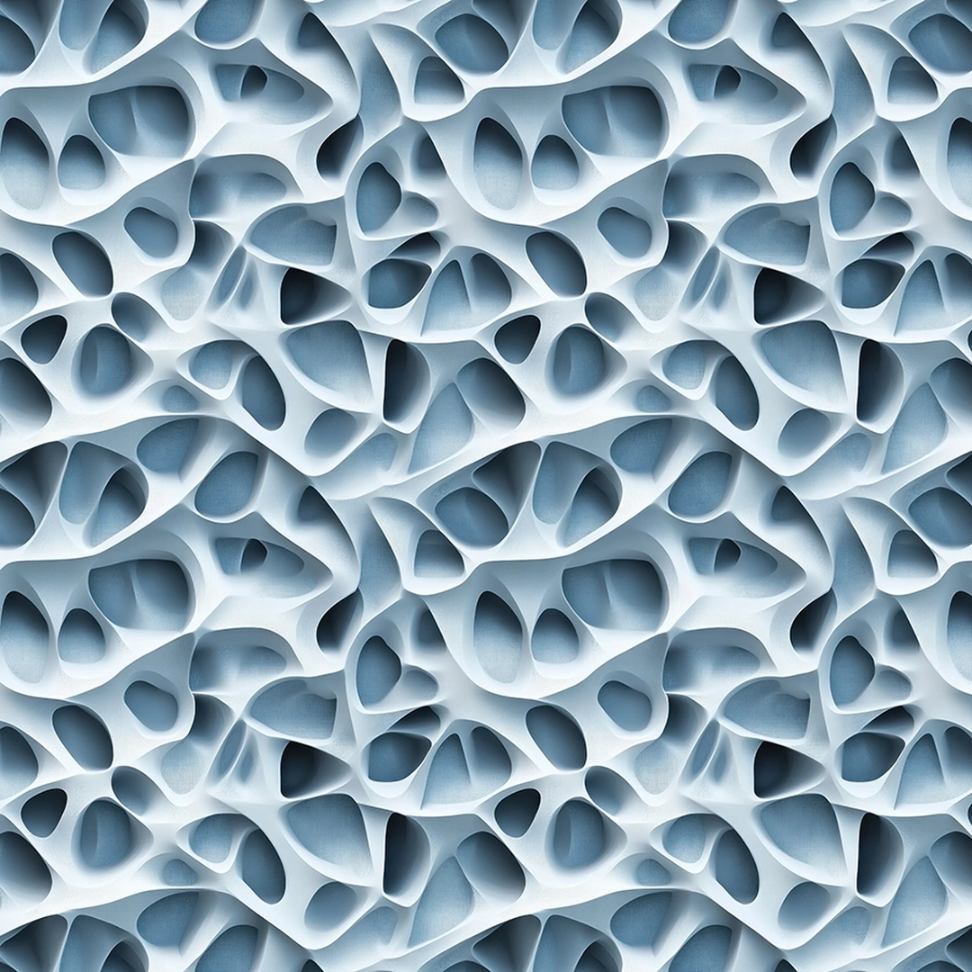 A complex pattern of overlapping organic shapes in cool blue tones creates a web-like texture.