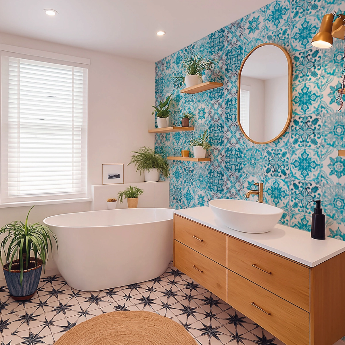 Add a splash of Mediterranean charm to your bathroom with this vibrant blue tile-effect wallpaper. Perfect for creating a fresh, spa-like ambiance