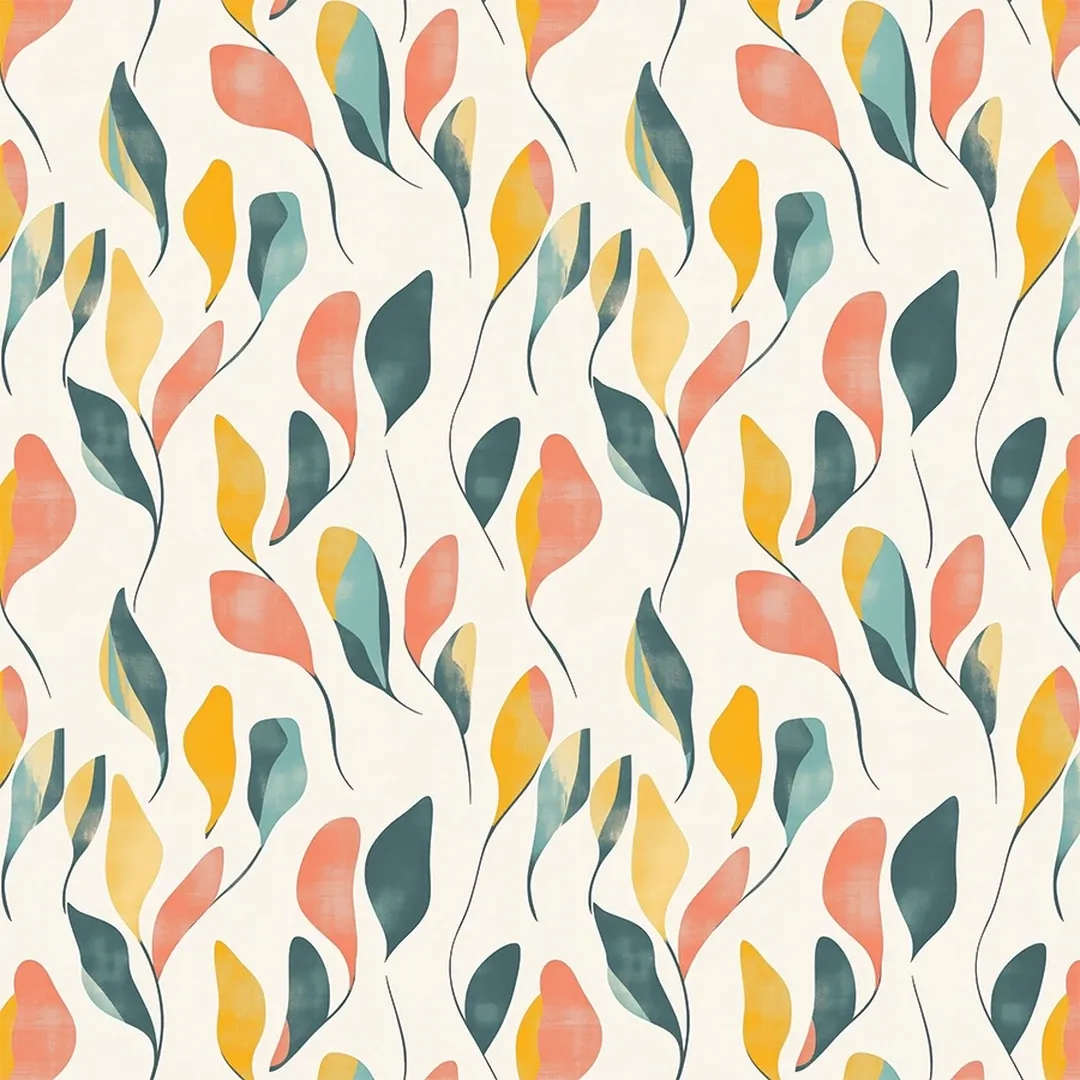 A refreshing and elegant wallpaper adorned with delicate, hand-painted leaves in muted greens, warm yellows, and soft coral tones. The flowing, organic pattern creates a light and airy feel, making it an excellent choice for nature-inspired and tranquil interior spaces.