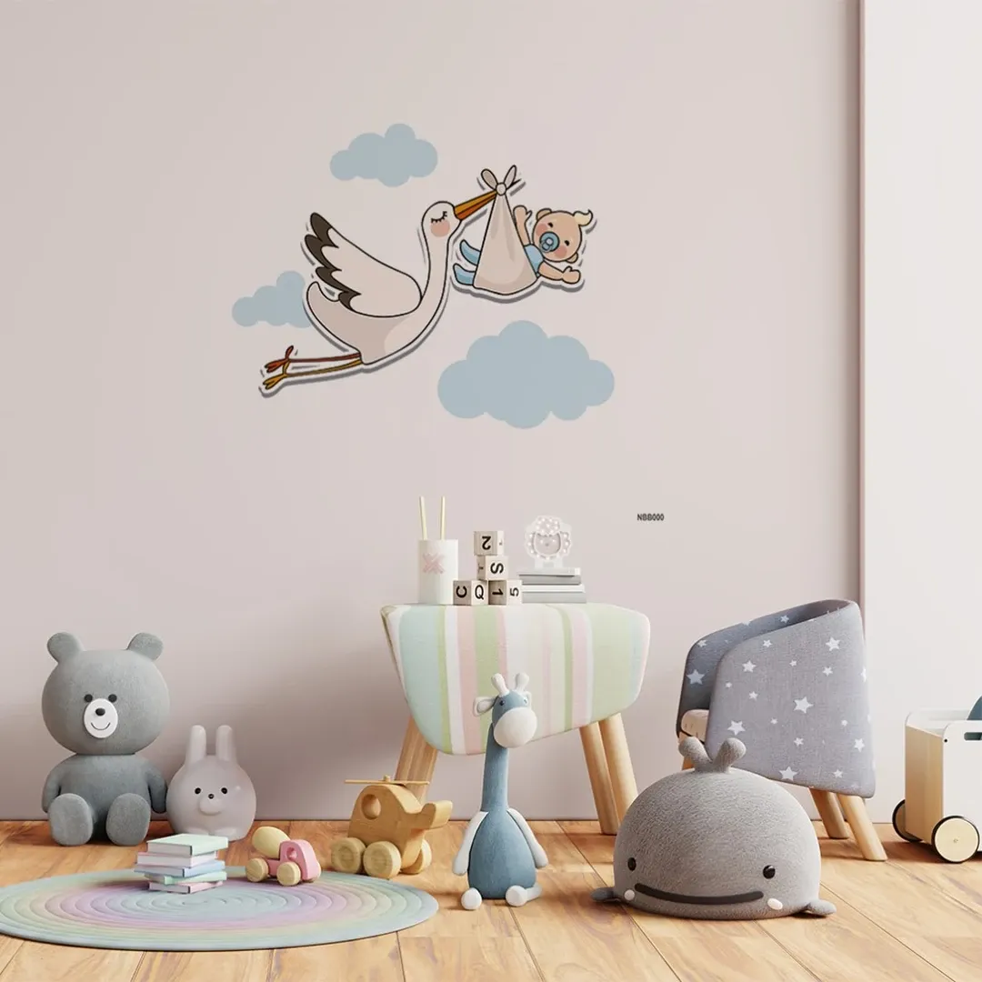 This heartwarming wallpaper design showcases a classic stork carrying a baby bundle through fluffy clouds. A timeless and charming choice for nurseries, baby rooms, or spaces celebrating new beginnings and parenthood.