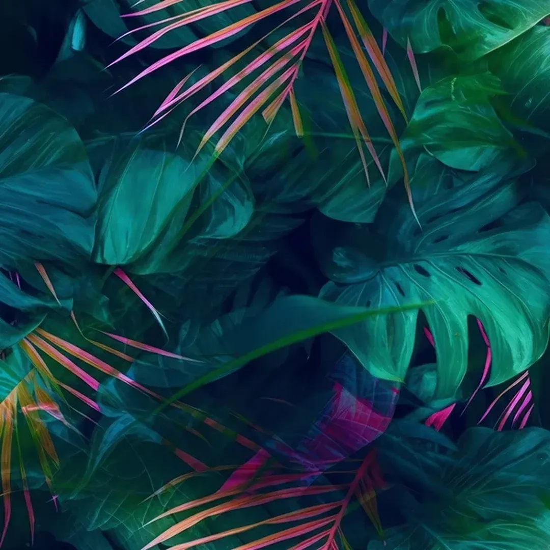 This wallpaper features a rich composition of large, dark teal leaves interspersed with subtle pink accents from slender palm fronds. The colors contrast beautifully, creating an exotic, tropical vibe that brings energy and intrigue to any room. Ideal for adding a touch of the rainforest indoors, it adds depth with its layered foliage and subtle color highlights.
