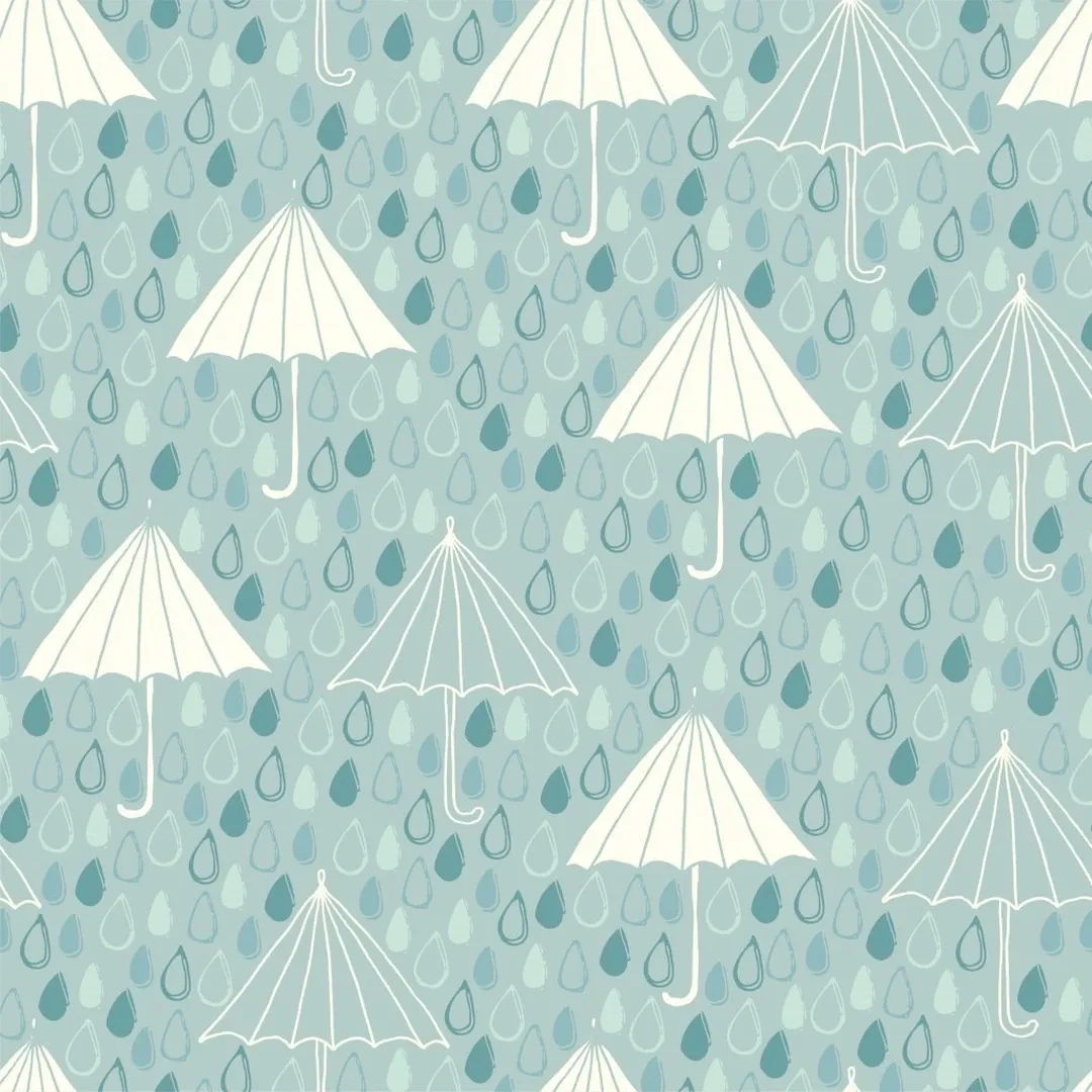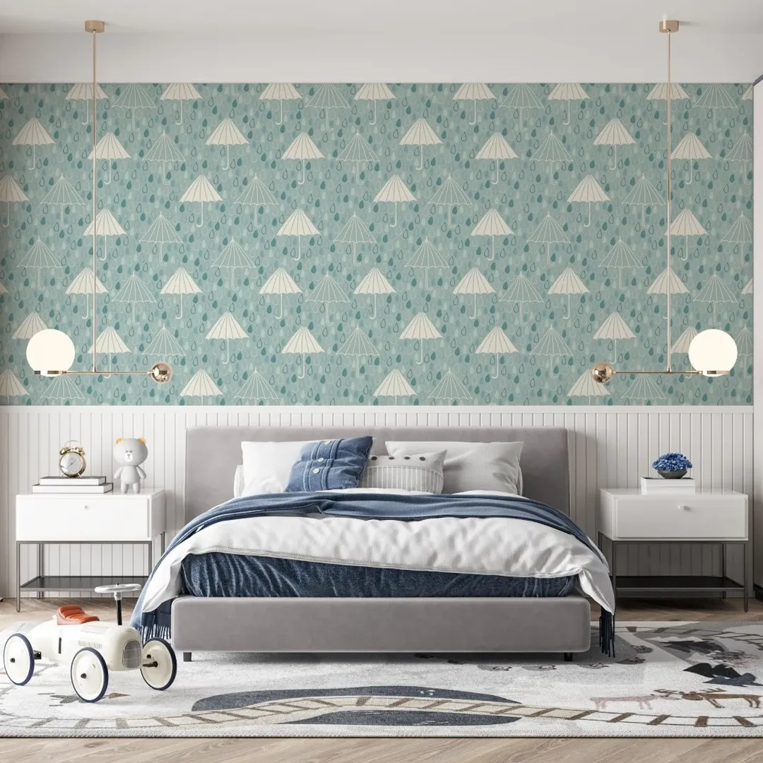 Embrace rainy-day charm with this delicate wallpaper featuring white umbrellas and cascading raindrops on a soft blue background. The repeating pattern adds a playful yet refined touch to bedrooms, bathrooms, or reading nooks.