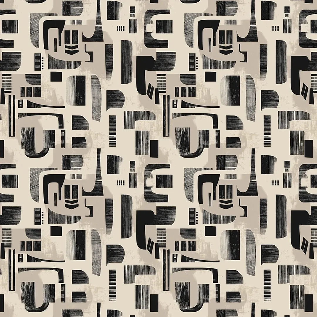 A bold and intricate pattern inspired by urban architecture and modernist design. The black and beige color palette enhances the layered geometric shapes, creating a visually dynamic and sophisticated look for any interior.