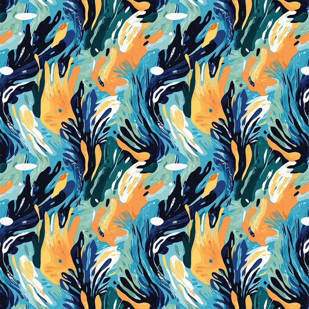 An electrifying design inspired by the fluidity of ocean waves and natural textures. The energetic brushstrokes in shades of deep blue, teal, mustard, and white create a captivating sense of movement, making it a bold and dynamic choice for artistic or modern interiors.