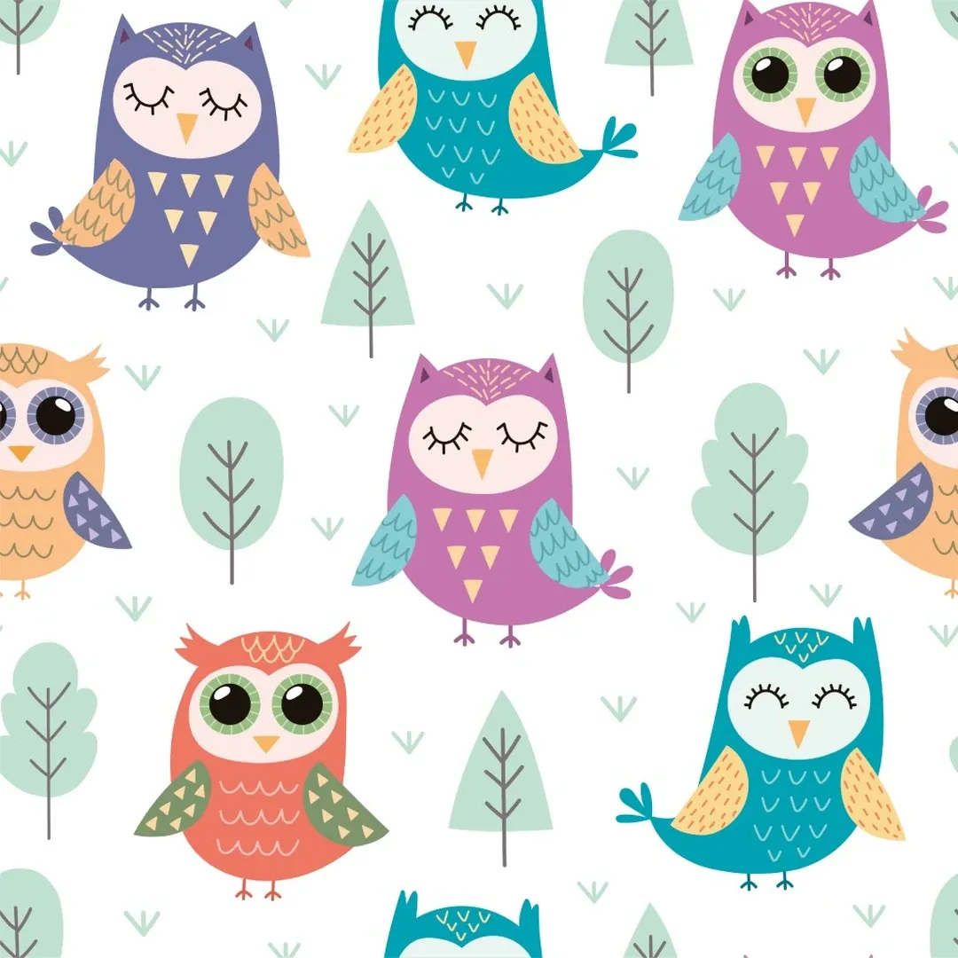 A vibrant and whimsical design showcasing various colorful owls perched against a white background. The owls are depicted in shades of purple, teal, orange, and pink, each with unique patterns like triangle feathers and closed or wide-open eyes. Small pastel green trees fill the space, giving it a woodland-inspired aesthetic.