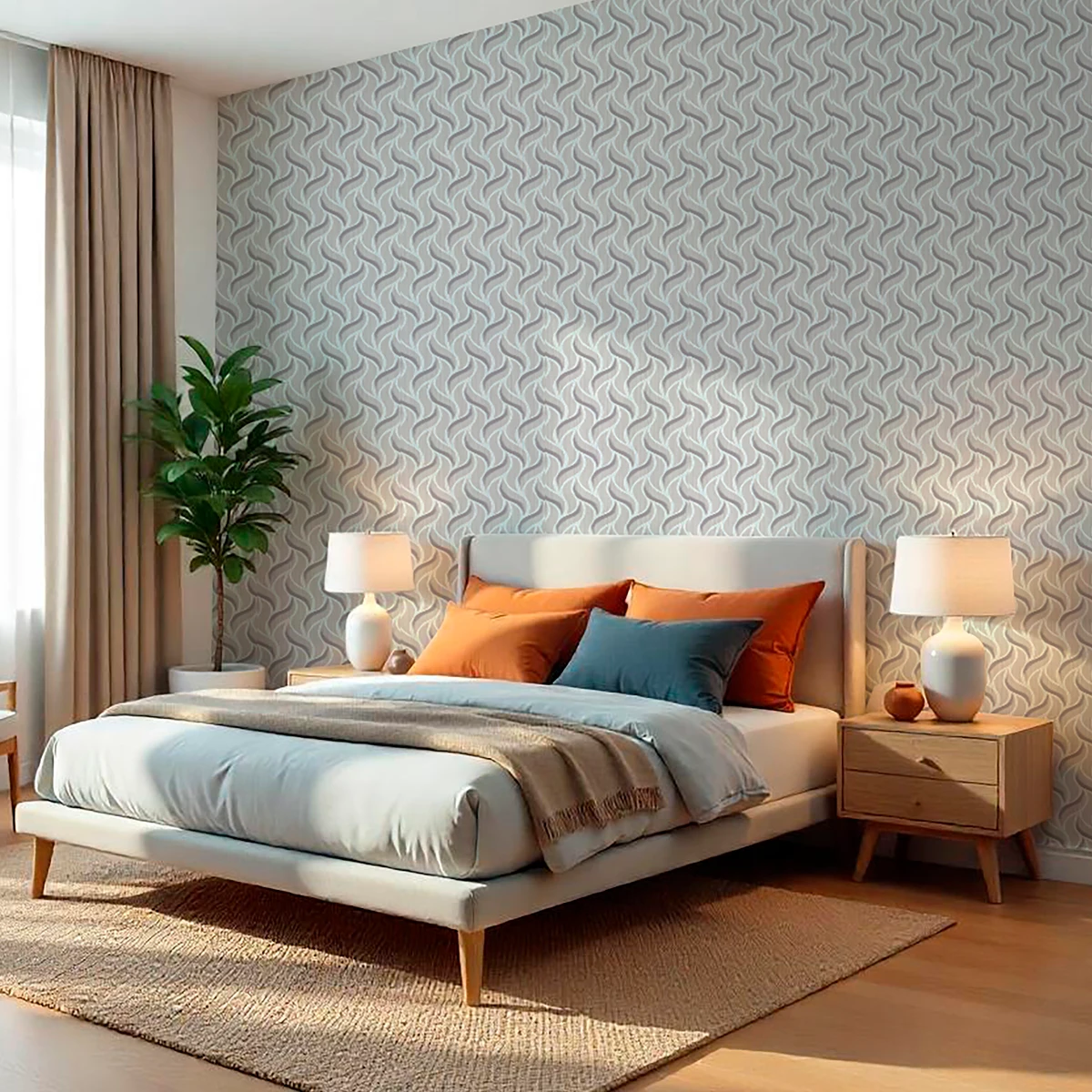 Add depth and movement to your bedroom with this stylish 3D wave-patterned wallpaper – a modern design that brings visual interest and elegance to any space.